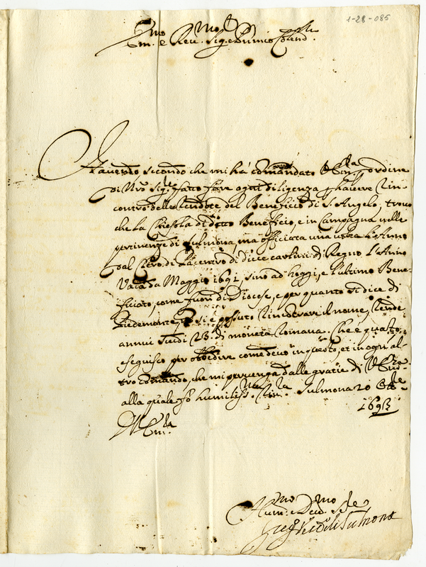 Sulle rendite del beneficio semplice di Sant'Angelo nelle pertinenze di Sulmona per morte di Nicola Baffi (1693 ottobre 20)