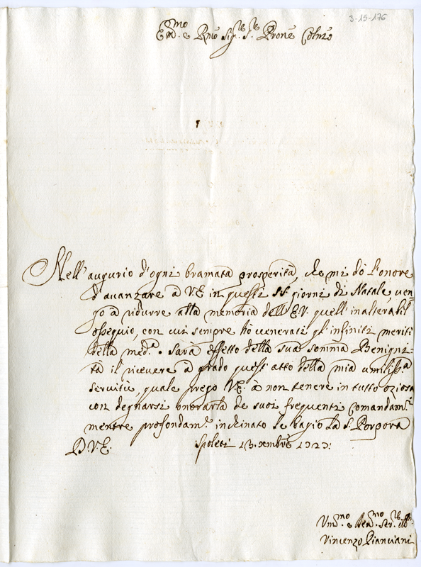 Lettera di Vincenzo Pianciani al cardinale Annibale Albani (1727 dicembre 13)
