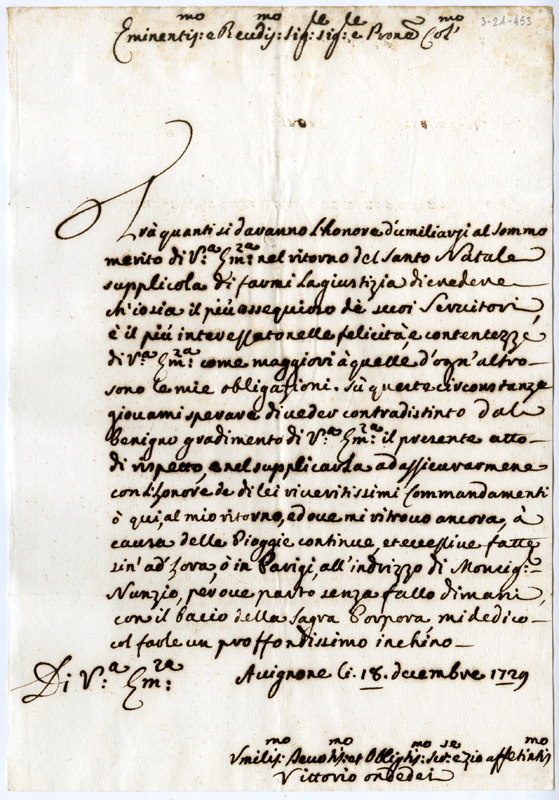 Lettera di Vittorio Ondedei al cardinale Annibale Albani (1729 dicembre 18)