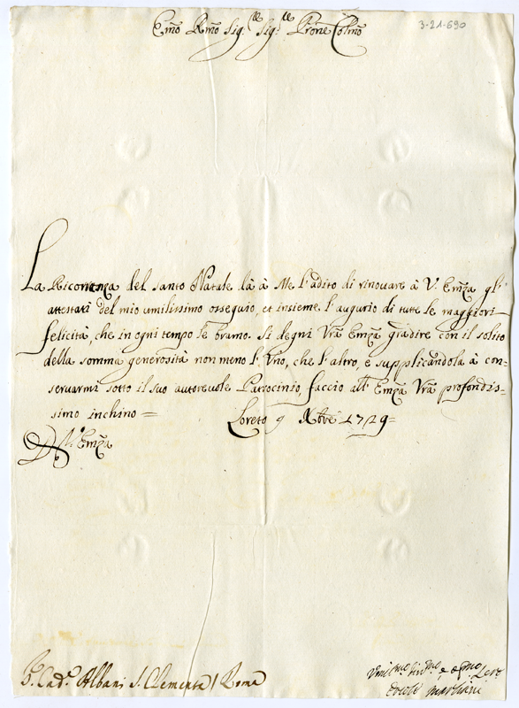 | bo.livello.titolo2 | Archivio Albani|Lettere di buone feste|"1729 B.Feste"|2|Documenti contenuti | |