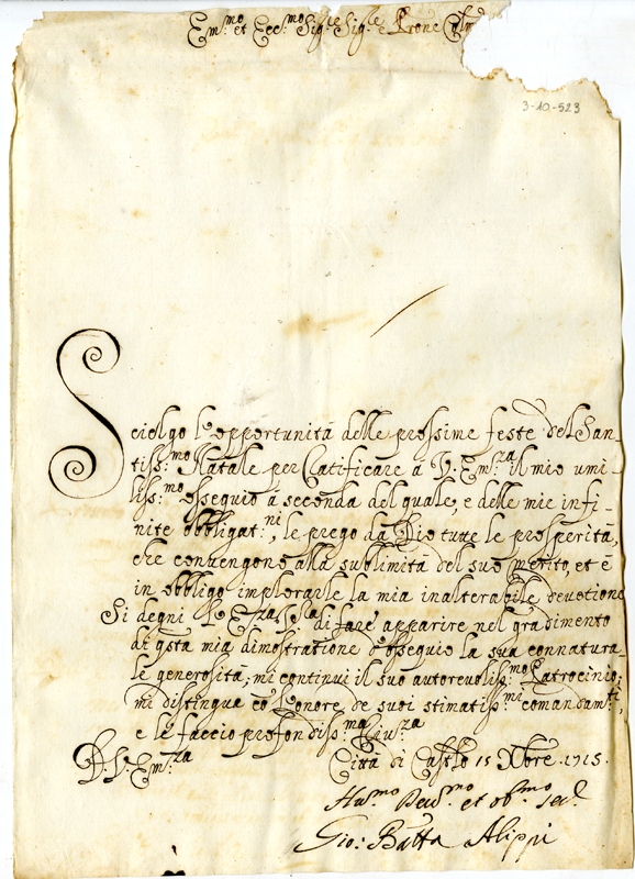 Lettera di Giovanni Battista Alippi al cardinale Annibale Albani (1715 dicembre 15)