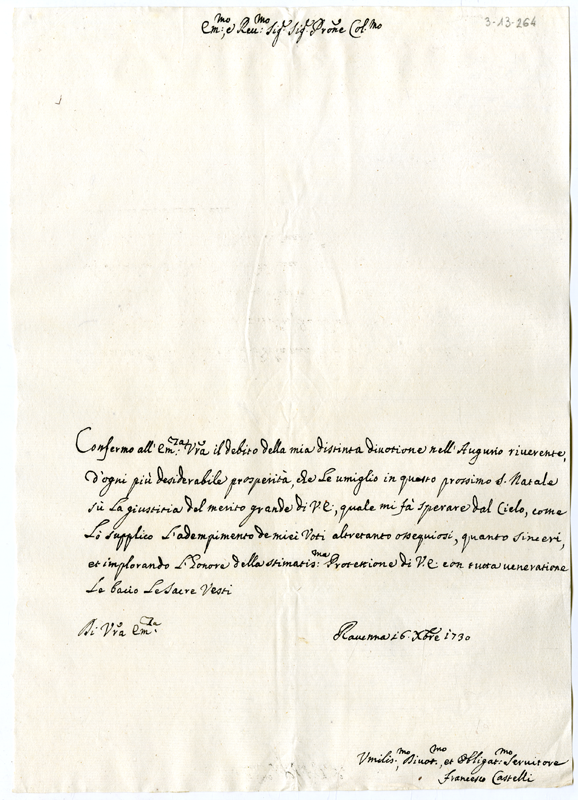 Lettera di Francesco Castelli al cardinale Annibale Albani (1730 dicembre 16)