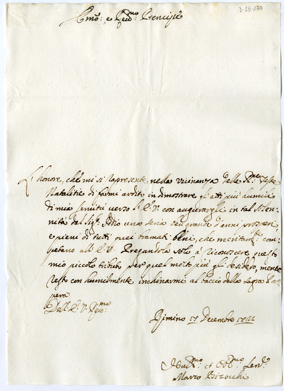 Lettera di Marco Bizocchi al cardinale Annibale Albani (1721 dicembre 17)