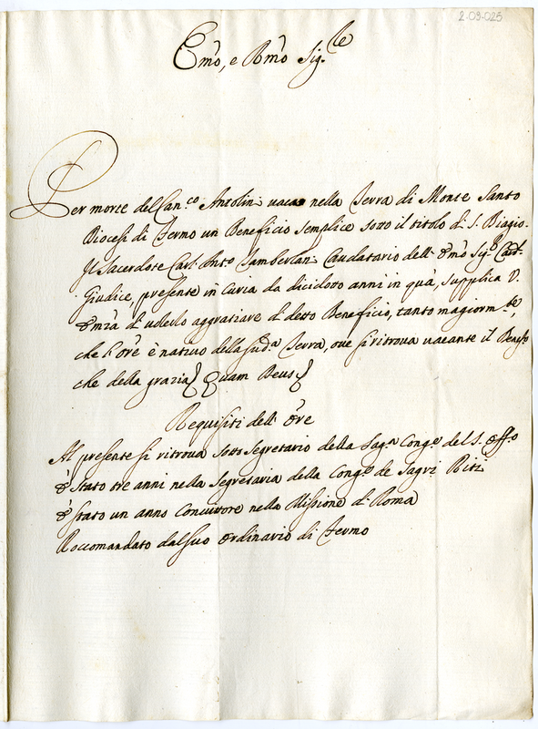 Supplica il cardinale per un beneficio lasciato vacante dal canonico Antolini, presenta i suoi requisiti