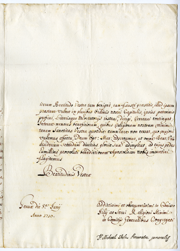 Lettera di fra Michael Stela dei Servi Minimi a Clemente XI (1713 gennaio 22)