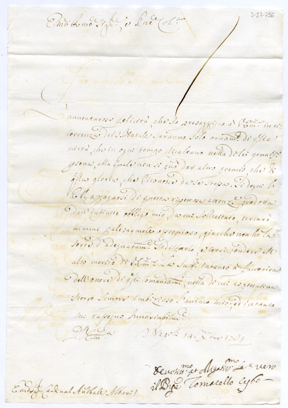 Lettera del principe Tomacello Cybo al cardinale Annibale Albani (1723 dicembre 14)
