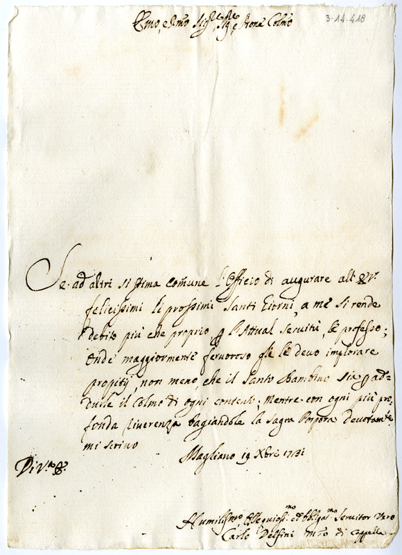 Lettera di Carlo Delfini al cardinale Annibale Albani (1731 dicembre 19)