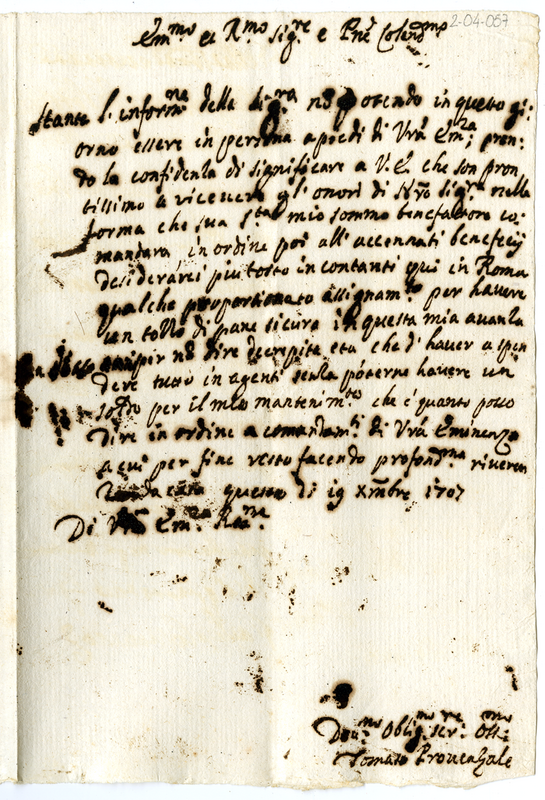 Lettera di Tommaso Provenzale ad un Cardinale (1707 dicembre 19)