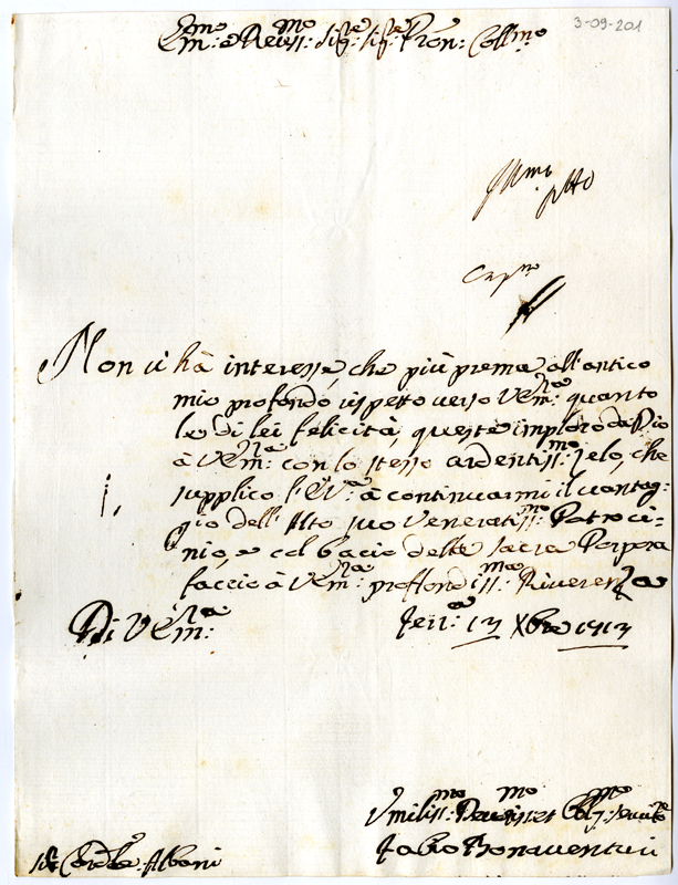 Lettera di Fabio Bonaventuri al cardinale Annibale Albani (1713 dicembre 13)