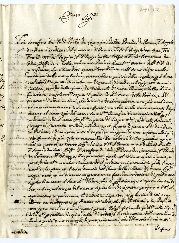 Lettera dei frati cappuccini della provincia di Roma al cardinale Albani (1692)