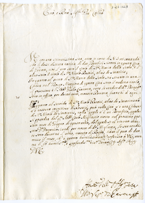 Lettera del Vescovo di Gerace ad un Cardinale (1699 agosto 29)