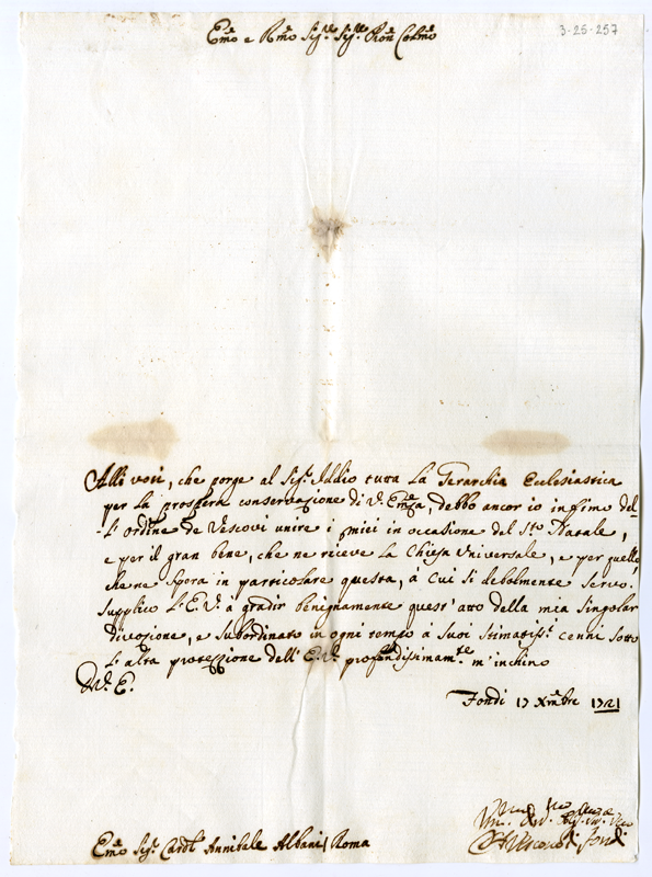 Lettera di Antonio vescovo di Fondi al cardinale Annibale Albani (1721 dicembre 17)