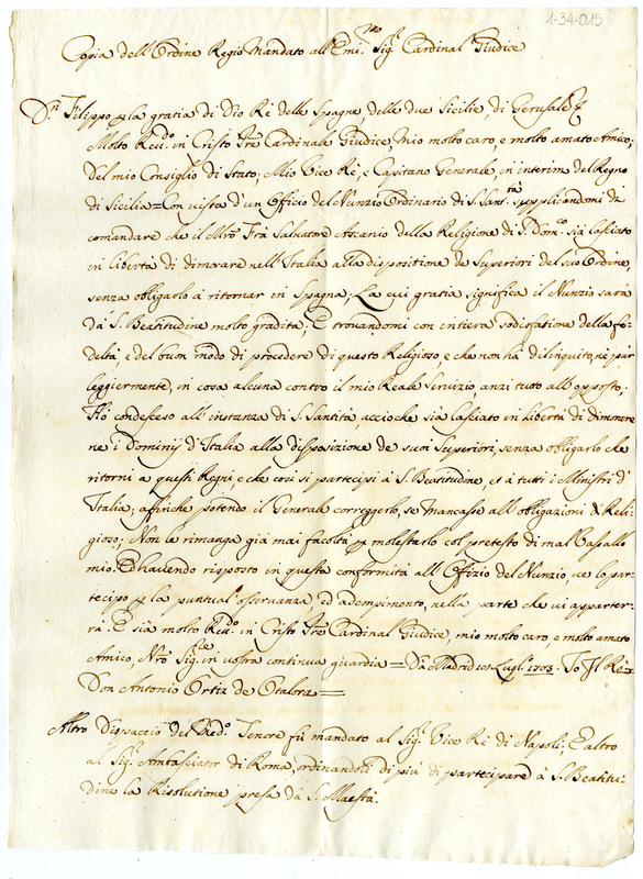 Copia dell'ordine Regio mandato all'Illustrissimo Cardinale Giudice dal Re di Spagna Filippo V a favore del maestro fra Salvatore Ascanio domenicano (1703 luglio 18)