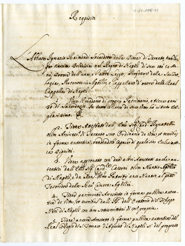 E' la copia del documento Requisiti dell'Abate Ignazio Raimondi (1700-1721)
