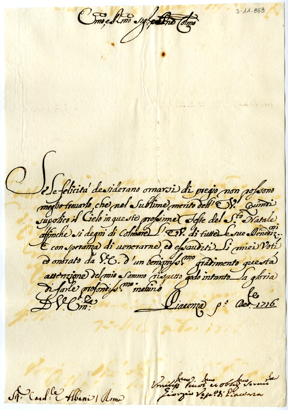 Lettera di Giorgio vescovo di Piacenza al cardinale Annibale Albani (1716 dicembre 1)