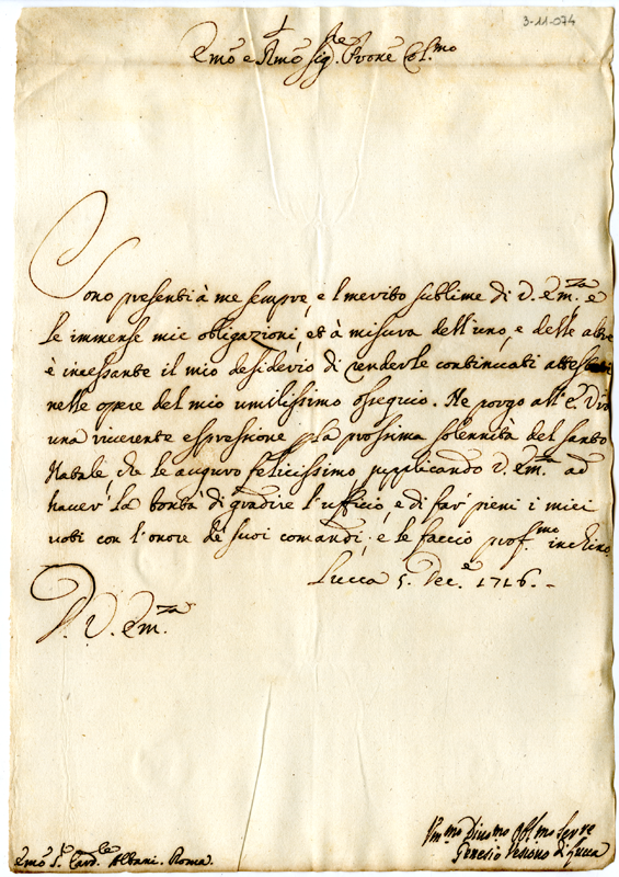 Lettera di Genesio vescovo di Lucca al cardinale Annibale Albani (1716 dicembre 5)