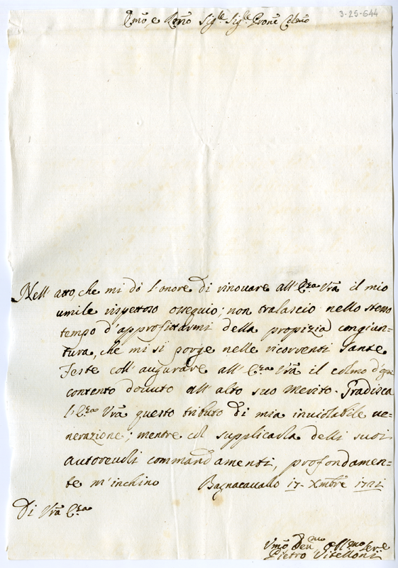 Lettera di Pietro Vitelloni al cardinale Annibale Albani (1721 dicembre 17)
