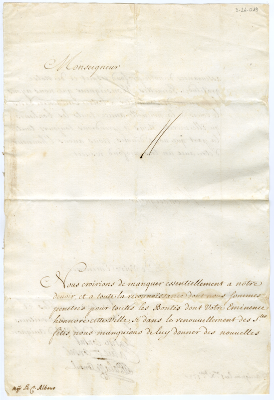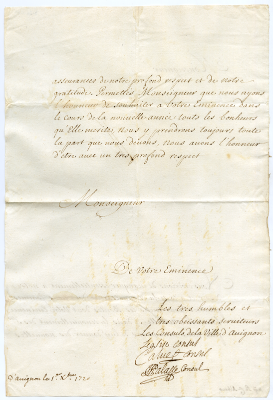 Lettera dei consoli della città di Avignone al cardinale Annibale Albani (1720 dicembre 1)
