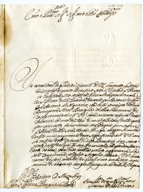 Lettera di Giacinto Vescovo di Ariano al Cardinale Panciatici (1699 marzo 2)