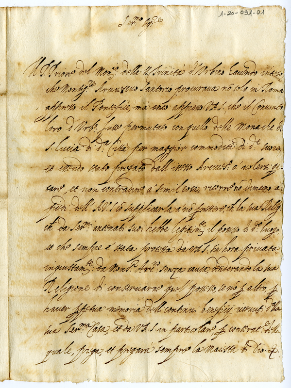 Lettera a Francesco Maria Della Rovere ultimo Duca di Urbino da parte del Priore del monastero della SS. Trinità di Urbino (1625)