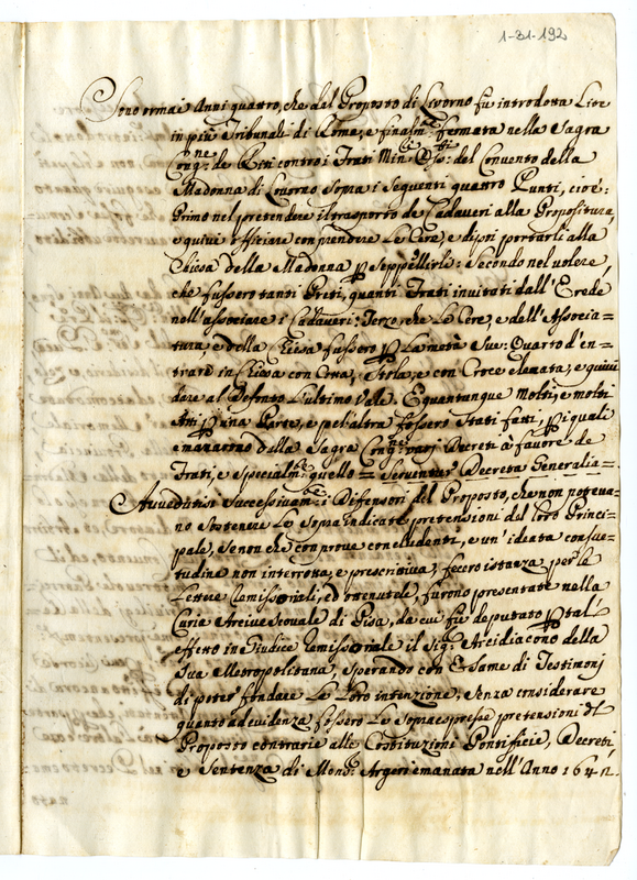 Archivio Albani|"Scritture spettanti alli frati dell'ordine de minori Conventuali, Osservanti, Riformati, Capuccini"|"1715 Livorno Lettere, e altre scritture appartenenti alle differenze vestenti tra li Frati Minori Osservanti di San Francesco di Santa Maria di Livorno, e il Proposto di quella Collegiata"|Documenti contenuti