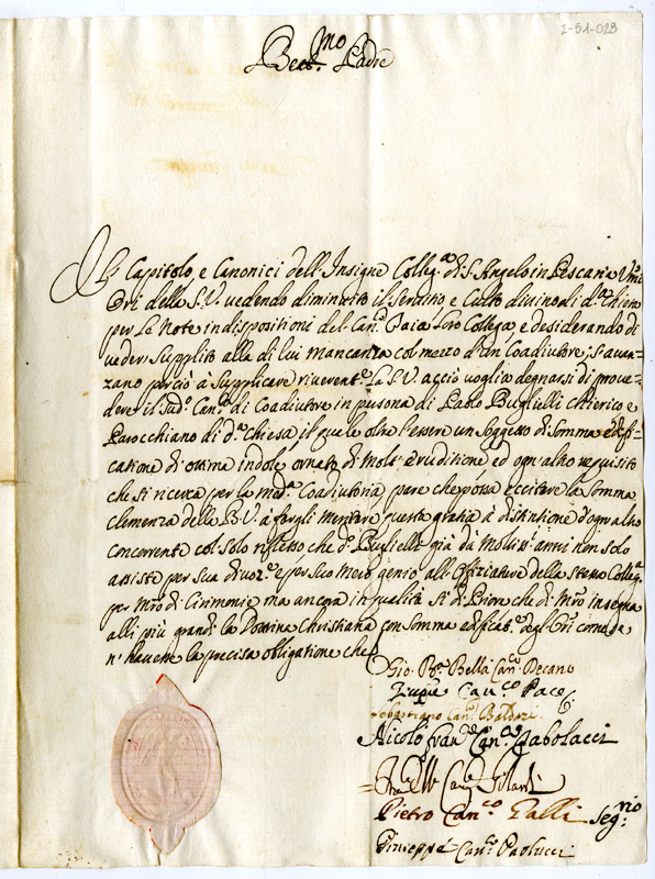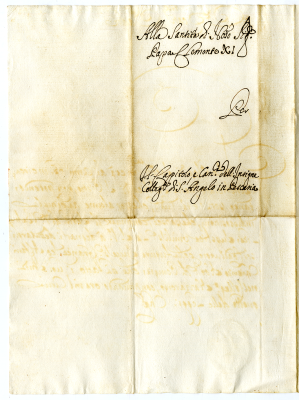 Lettera del capitolo e canonici dell'insigne collegiata di Sant'Angelo in Pescaria a papa Clemente XI (1700-1721)