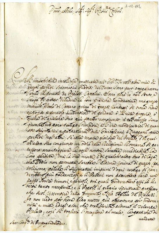 | bo.livello.titolo | Archivio Albani|Albani Giovanni Francesco|Incarichi e cariche|Vescovati e benefici ecclesiastici|Stato di Venezia, Dalmazia e paesi confinanti|Scritture spettanti alli vescovati, e beneficj ecclesiastici vacati, e provisti da Papa Clemente XI. Nello stato de veneziani nella Dalmazia, e paesi aggiacenti, e nell'isole dell'arcipelago|Chiese di Dalmazia | |
