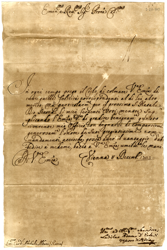 Lettera di Ladislao Adamo d'Erdodi vescovo di Nitra al cardinale Annibale Albani (1723 dicembre 8)