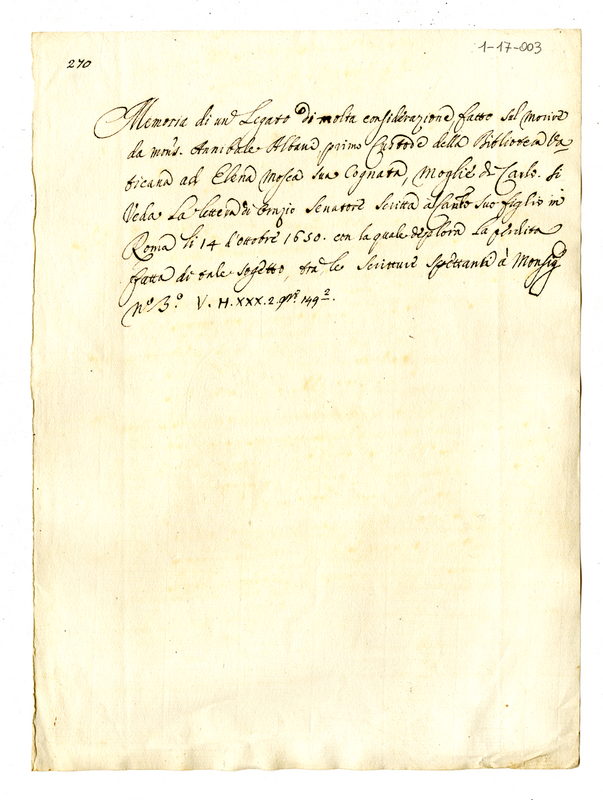 Memoria d'un legato di molta considerazione fatto sul morire da monsignor Annibale Albani