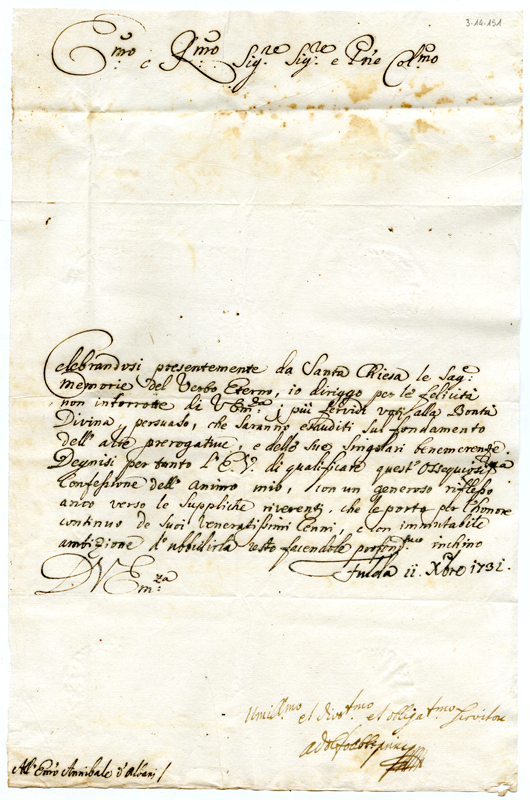 Lettera di Adolf von Dalberg principe-abate di Fulda al cardinale Annibale Albani (1731 dicembre 11)