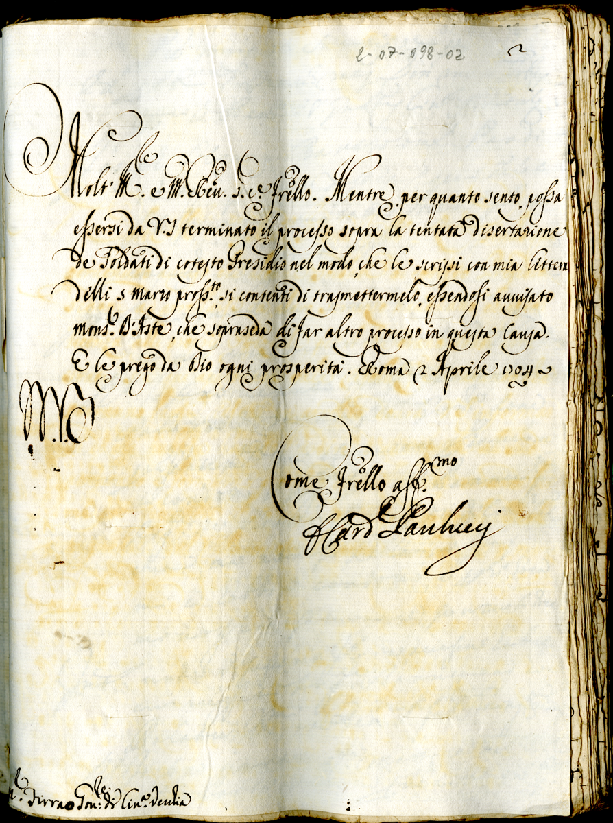 Lettera del cardinale Paolucci a monsignor Firrao governatore di Civitavecchia (1704 aprile 2)