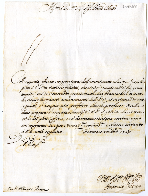 Lettera di Antonio Vidman ad Annibale Albani (1708 dicembre 10)