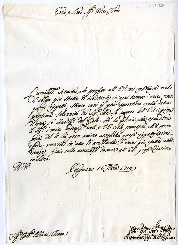 Lettera di Pietro Antonio vescovo di Polignano al cardinale Annibale Albani (1719 dicembre 16)