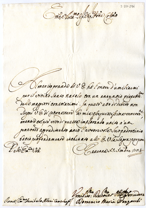 Lettera di Domenico Maria Panzacchi al cardinale Annibale Albani (1728 dicembre 11)