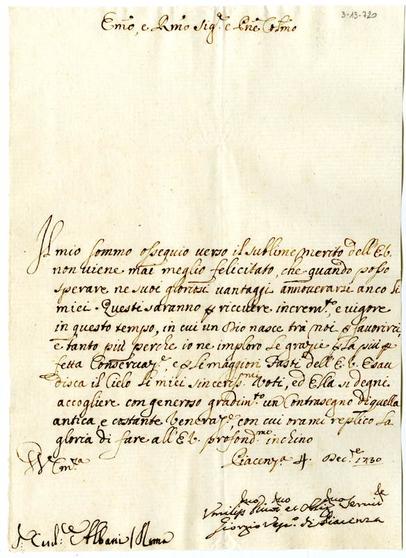 Lettera di Giorgio vescovo di Piacenza al cardinale Annibale Albani (1730 dicembre 4)