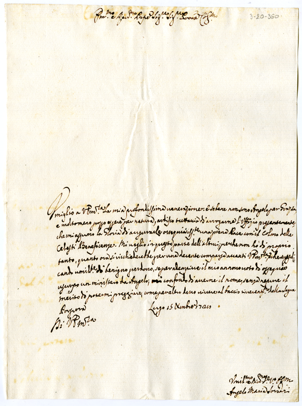Lettera di Angelo Maria Sorsari al cardinale Annibale Albani (1728 dicembre 15)