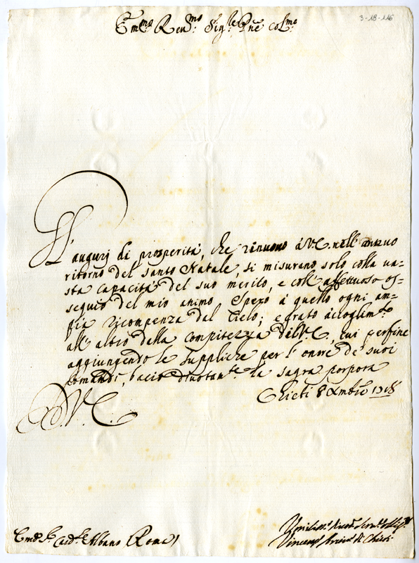 Lettera di Vincenzo arcivescovo di Chieti al cardinale Annibale Albani (1718 dicembre 8)