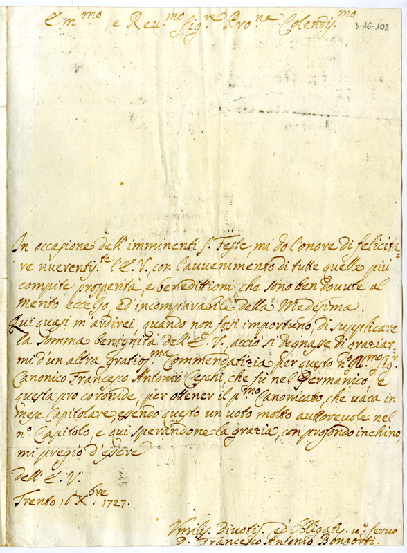 Lettera di don Francesco Antonio Bonporti al cardinale Annibale Albani (1727 dicembre 16)