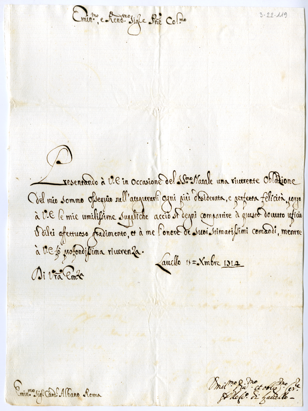 Lettera del vescovo di Lavello al cardinale Annibale Albani (1714 dicembre 15)