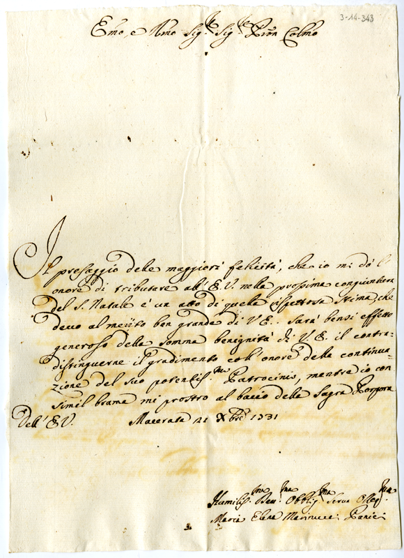 Lettera di Maria Elena Marinucci Panici al cardinale Annibale Albani (1731 dicembre 21)