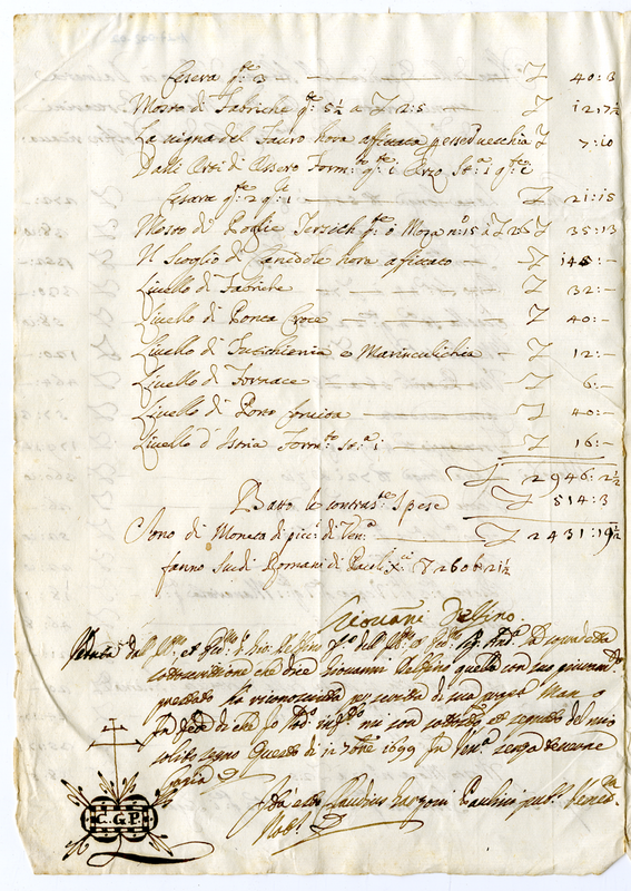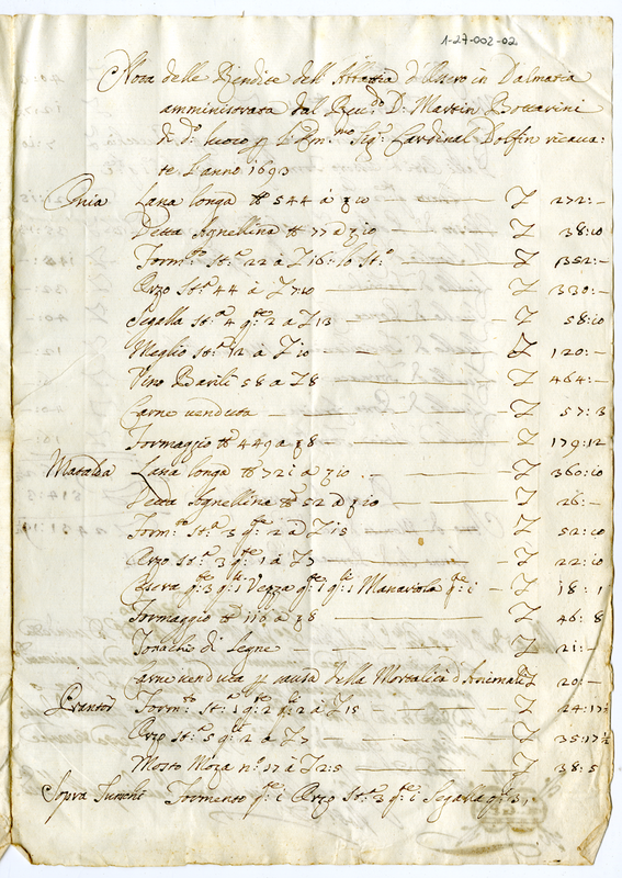 Nota delle rendite e delle spese dell'Abbazia d'Ossero in Dalmazia amministrata da Reverendo Don Martin Bottarini di detto luogo per l'Eminentissimo Signor Cardinale Dolfin ricavate l'anno 1693