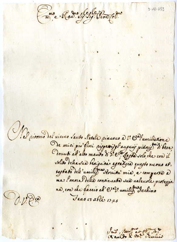 Lettera di Rinaldo di Monte Vecchio al cardinale Annibale Albani (1725 dicembre 13)