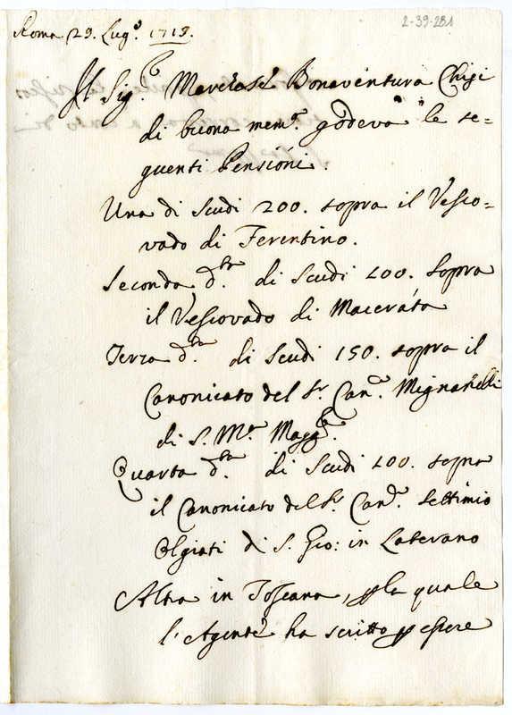 Pensioni che godeva il marchese Bonaventura Chigi (1713 luglio 29)