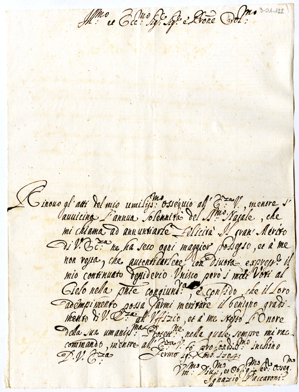 Lettera di Ignazio Paccaroni ad Annibale Albani (1704 dicembre 19)