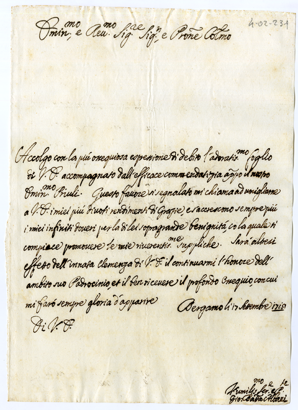 Lettera di Giovanni Battista Albani al Cardinale Annibale Albani (1715 settembre 17)