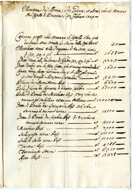 Monitione da Bocca e da Guerra, et Armi, che si trovano nel Castello di Piacenza li 27 febbraio 1702