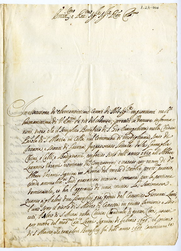 Lettera del Vicario Generale Padre Paolo Salvini ad un Cardinale (1698 gennaio 29)