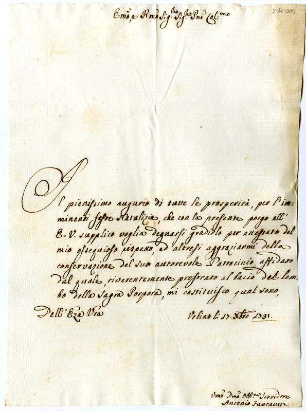 Lettera di Antonio Fantuzzi al cardinale Annibale Albani (1731 dicembre 17)