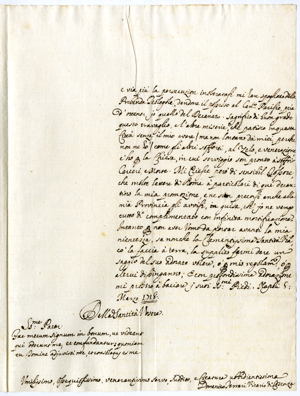 Lettera di Domenico Ferrari vicario di Cosenza a papa Clemente XI (1718 marzo 5)
