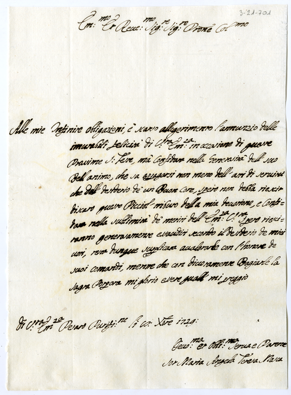 Lettera di suor Maria Angela Teresa Mosca al cardinale Annibale Albani (1729 dicembre 8)